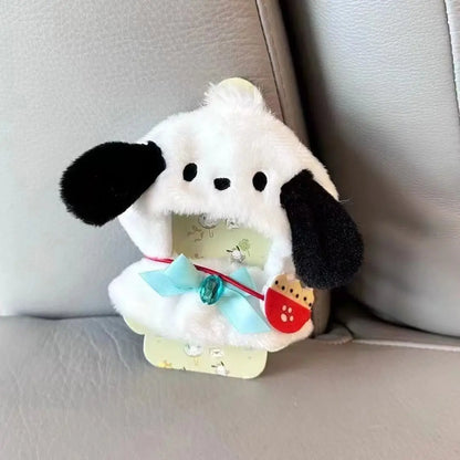 Made from soft plush material, this outfit includes a cozy cape, matching skirt, and hat accessory, perfect for themed displays, photo shoots, or creative dressing sessions.